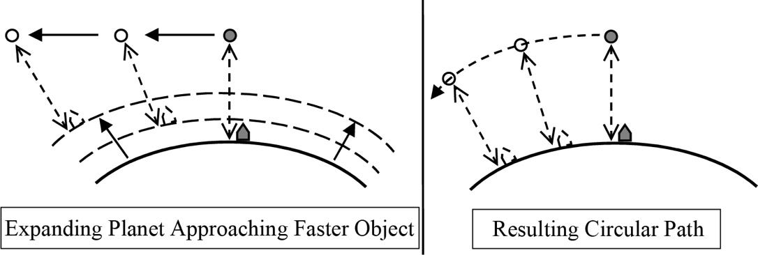 This explains orbits, and shows how an effect of relative motion is created, between what is happening behind the scenes, and what we see in our resulting reality. A satellite does not need to be accelerating behind the scenes, for a relative motion effect to cause an acceleration, in our resulting reality. The geometry of expansion, naturally accelerates all objects orbiting each other, in a permanent slingshot effect affecting all orbits.
